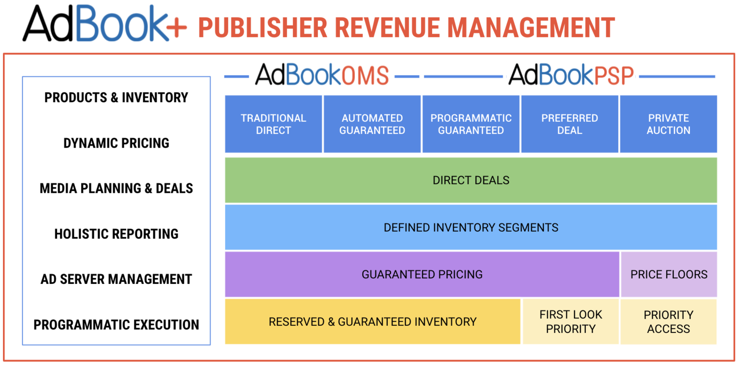 For PREMIUM PUBLISHERS, AdBookPSP offers programmatic distribution of differentiated inventory at non-commoditized pricing to high quality, direct advertisers. It provides an incremental revenue opportunity from DSPs in the form of private auction, preferred, and programmatic guaranteed deal types.